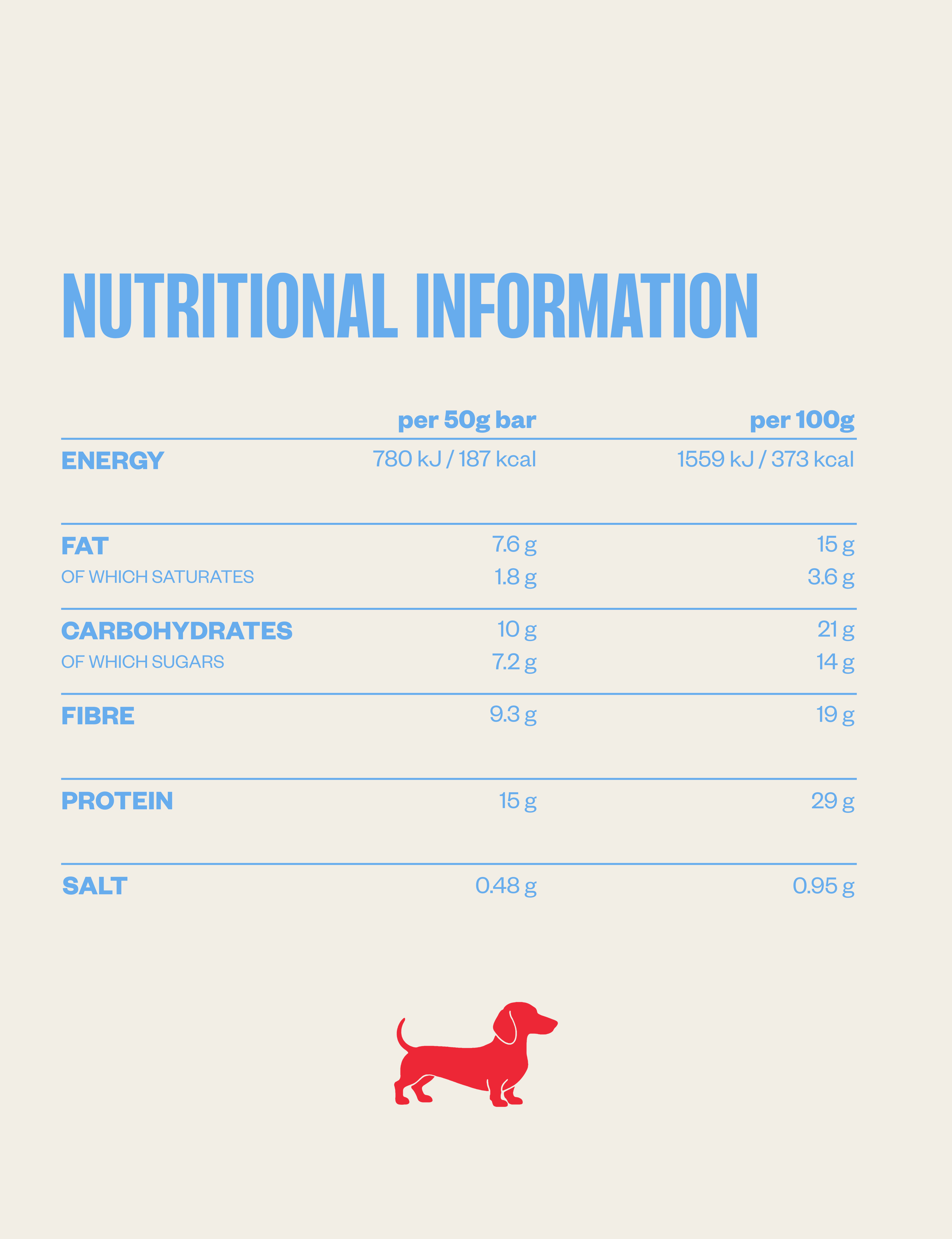 Proprietary protein blend (26%) [bovine collagen, pea protein], chicory root fibre, cashew nut butter (20%), maple syrup, maca powder, Dark Chocolate Chips (5%) [Cocoa Mass,  Coconut Sugar, Cocoa Butter], Nibbed Almonds (3.6%), psyllium husk, vanilla extract, ground cinnamon, sea salt, antioxidant: rosemary extract, monk fruit infusion (siraitia grosvenorii).